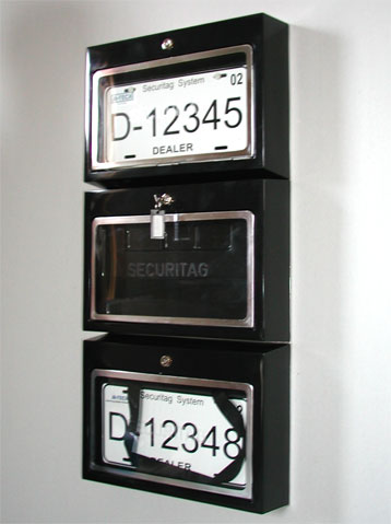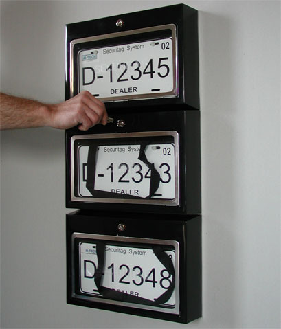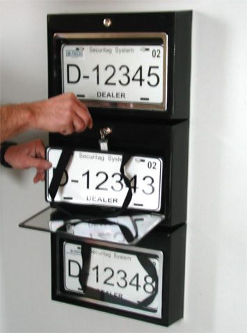 The Securitag WM-90 provides secure convenient location for your demo plates. Each plate is locked behind a clear polycarbonate door making the plate visible. The high security, American made, tubular key locks which are assembled to our strict specifications can be keyed alike or individually as required by our customers needs. Each person requiring access to dealer demo plates is provided with a numbered key. These numbered keys are assigned to each person requiring access to the WM-90. We recommend that you take a security deposit from them or actually sell the keys to them. In either case keep a record of the users name and their key number. Demo plates are accessed by using the numbered keys. Once the demo plate is accessed and removed from the WM-90 the users' key is trapped by the WM-90 and cannot be removed until the plate is replaced and the door closed. This makes each user accountable at all times as management can immediately identify the user who has the demo plate.